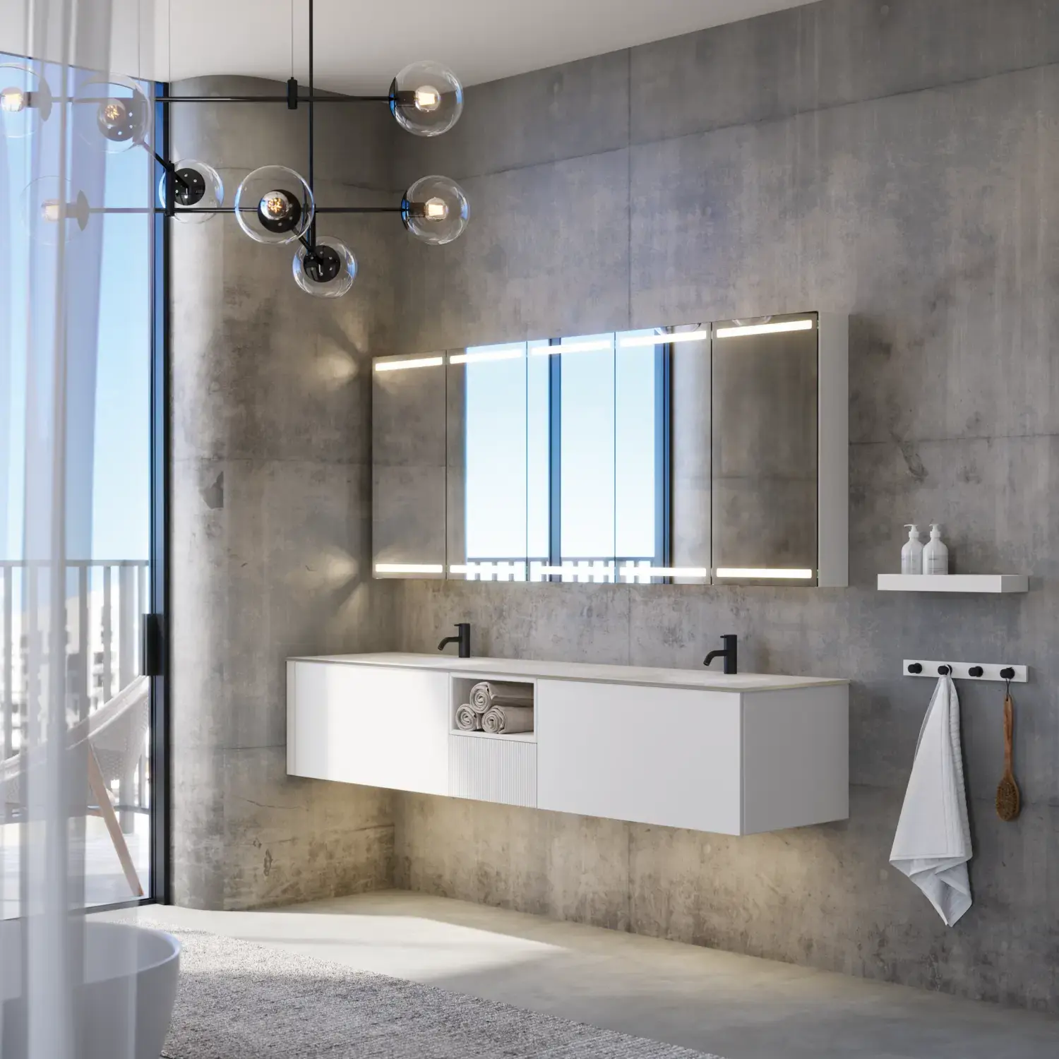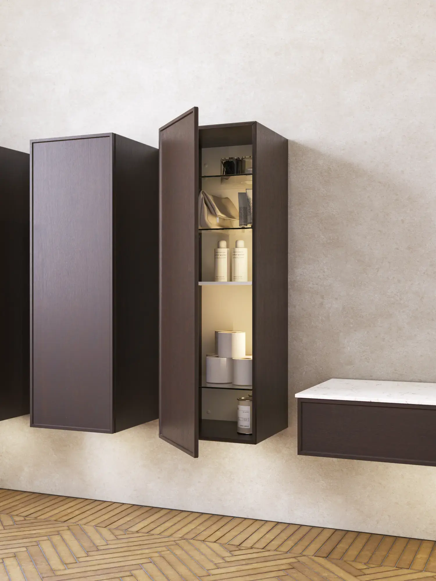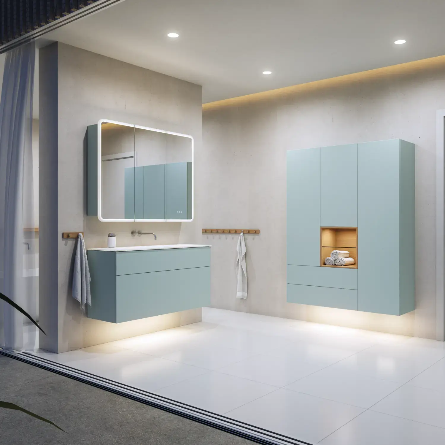 When aesthetics and functionality meet, a perfectly balanced space is created. With Calidris you can furnish your whole bathroom in a cohesive design – from elegant mirror cabinets and open shelves to floating tall units with integrated downlighting. Clean lines, tactile fronts and thoughtful details create an atmosphere of tranquility and exclusivity.