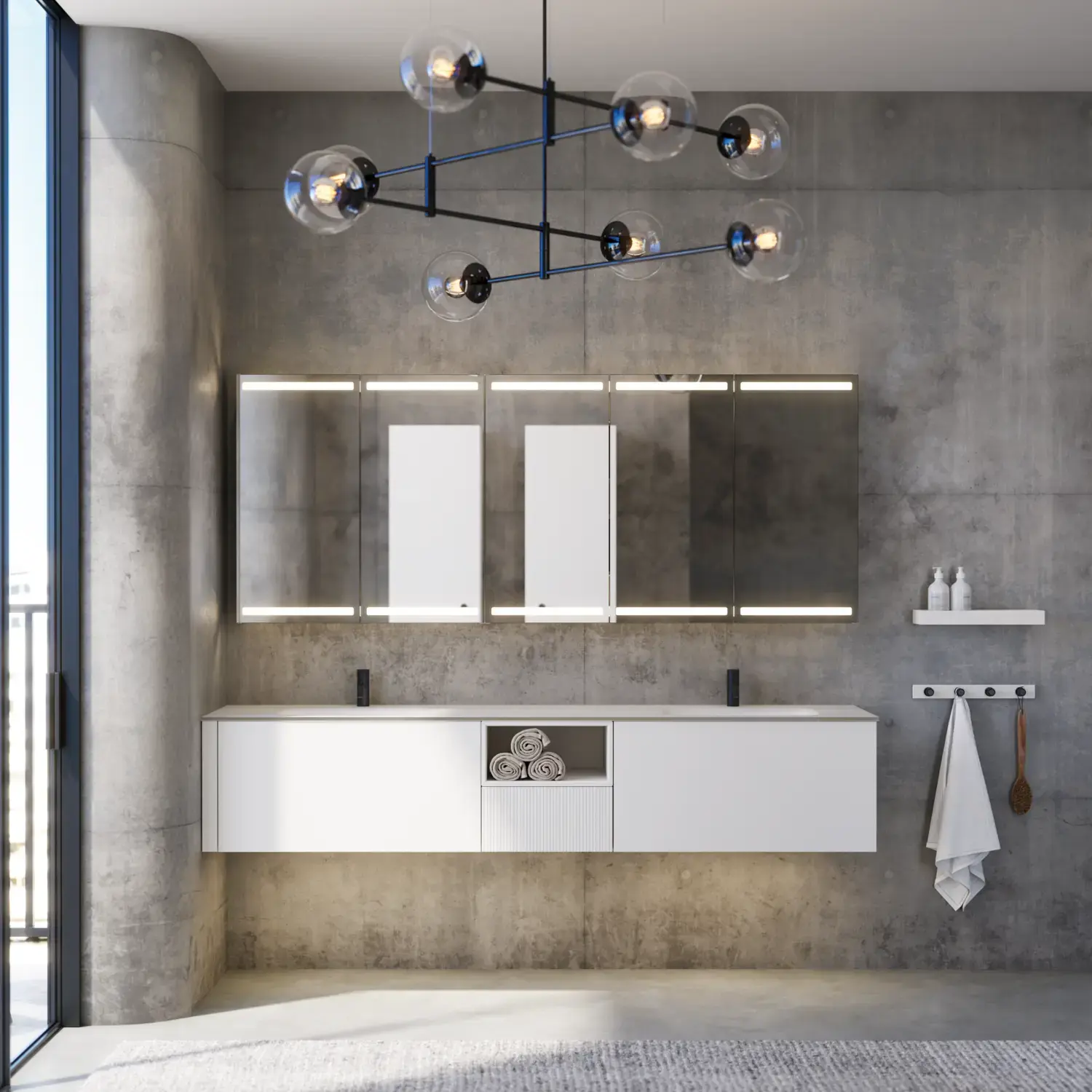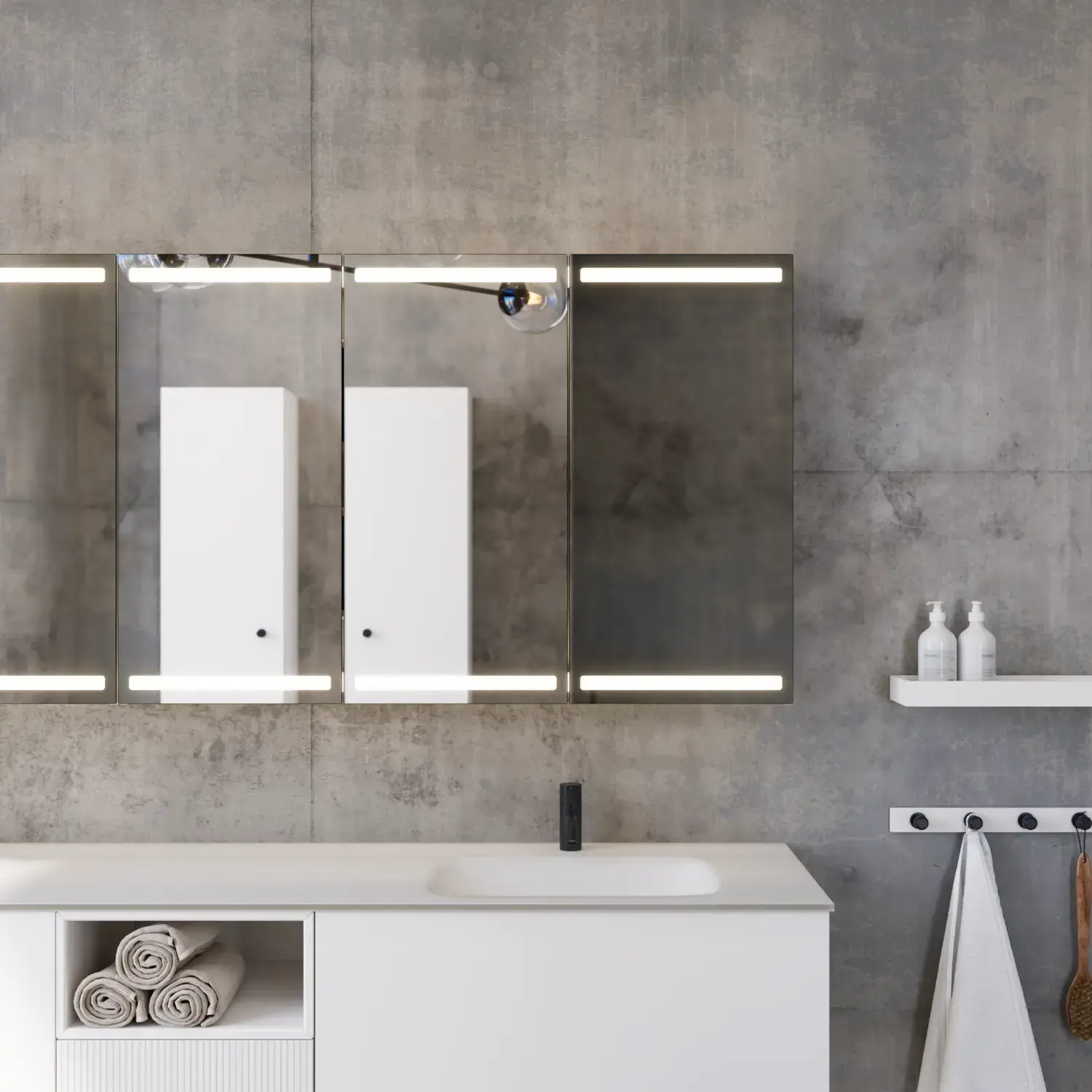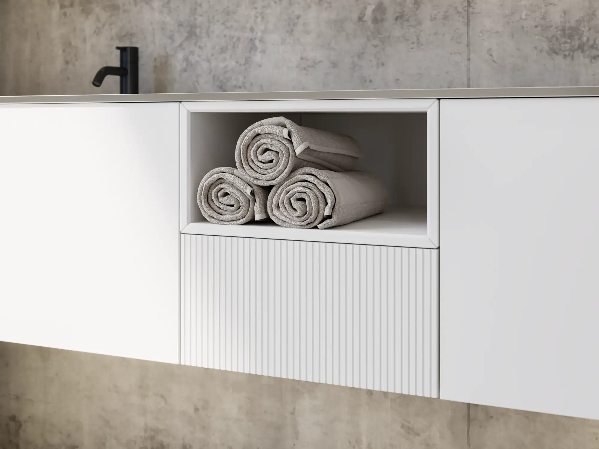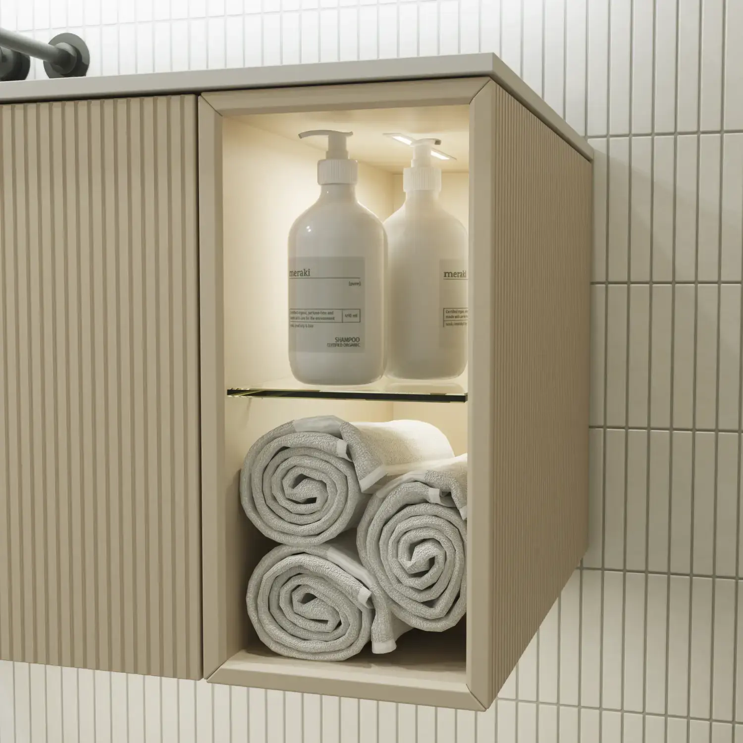 When aesthetics and functionality meet, a perfectly balanced space is created. With Calidris you can furnish your whole bathroom in a cohesive design – from elegant mirror cabinets and open shelves to floating tall units with integrated downlighting. Clean lines, tactile fronts and thoughtful details create an atmosphere of tranquility and exclusivity.