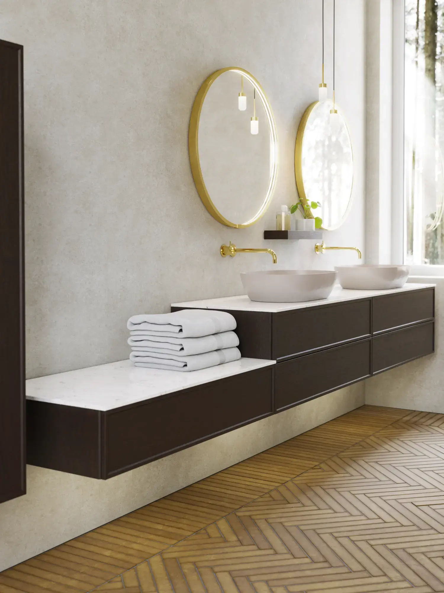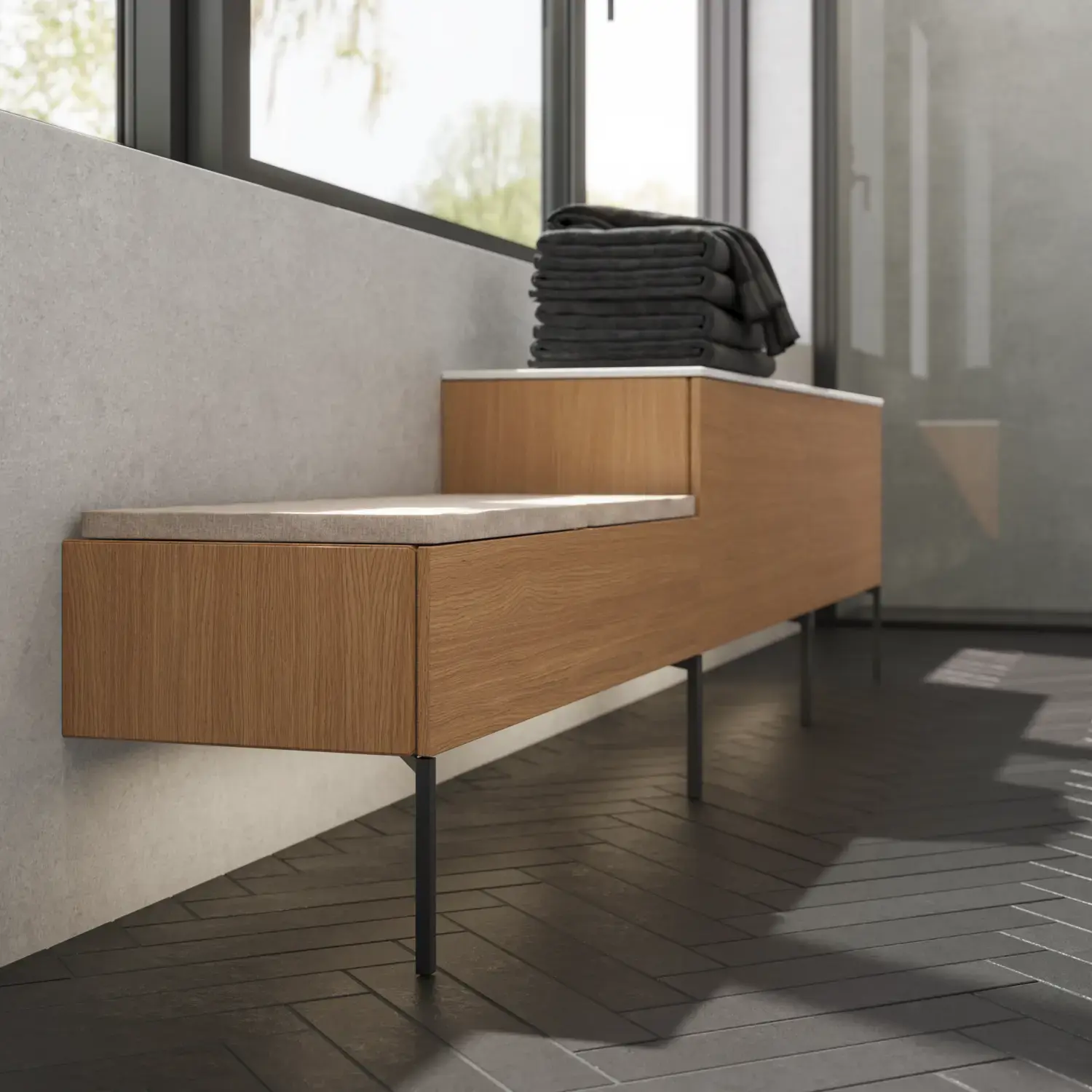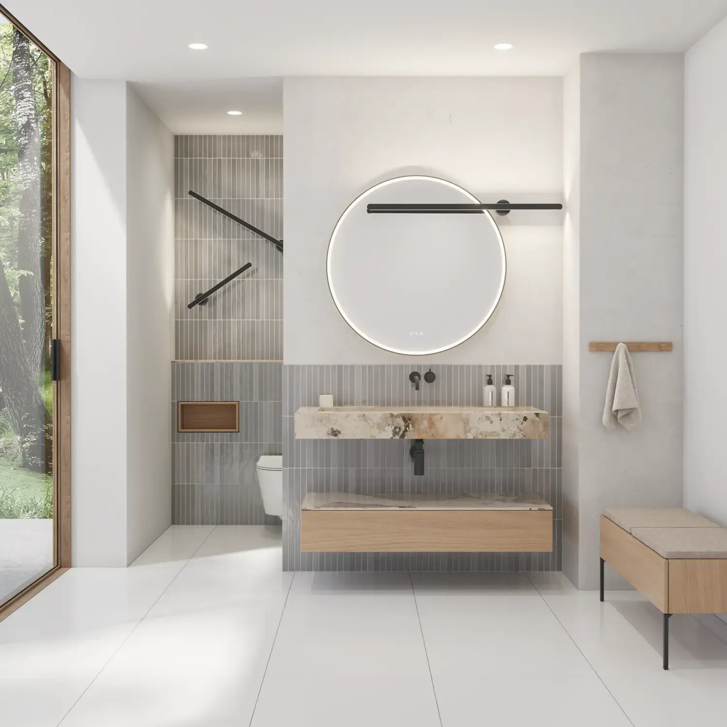 Pair it with the Linear lamp for a striking, contemporary lighting effect and complete the look with a wooden bench that adds warmth and personality. A bathroom design that captures today’s trends, grounded in the timeless elegance of Calidris.