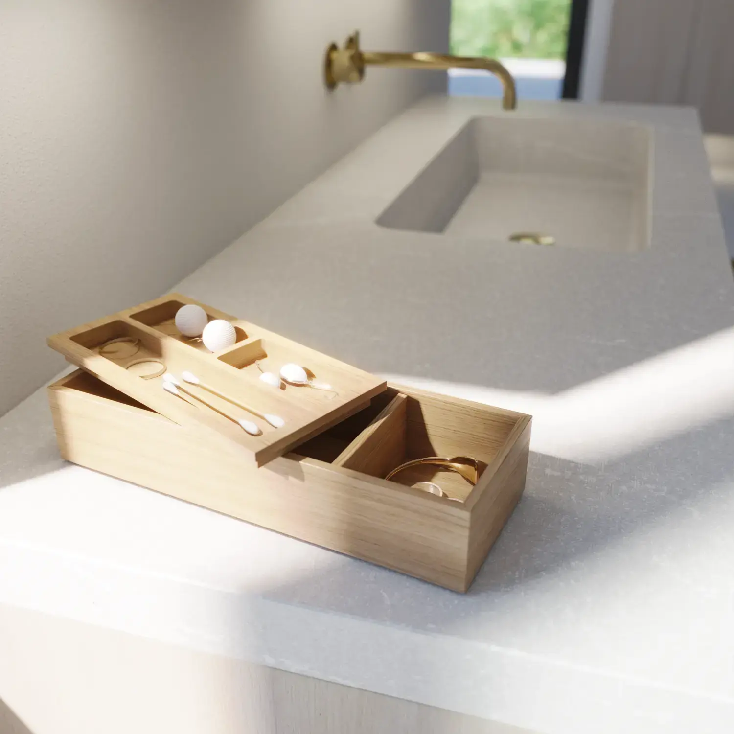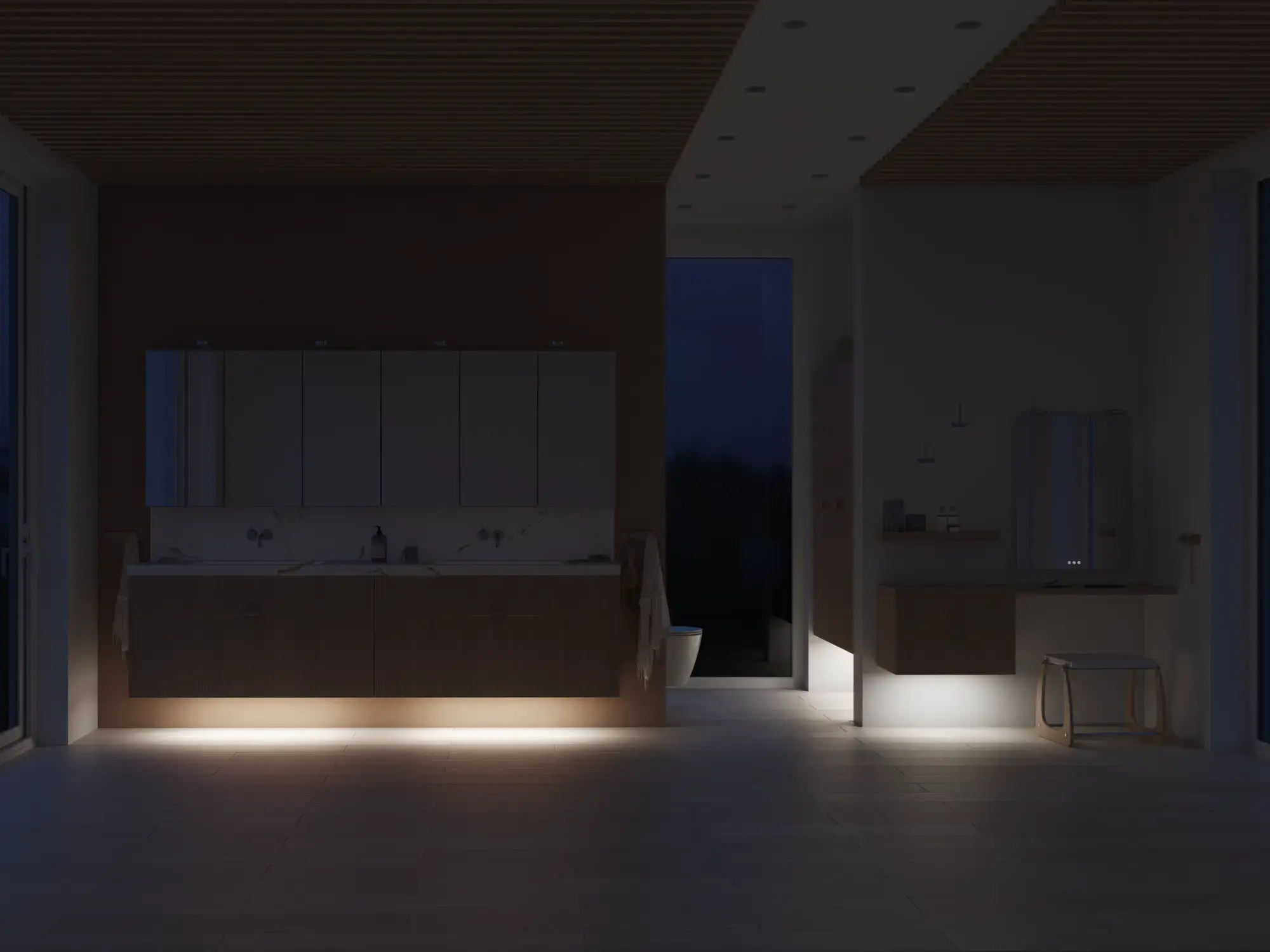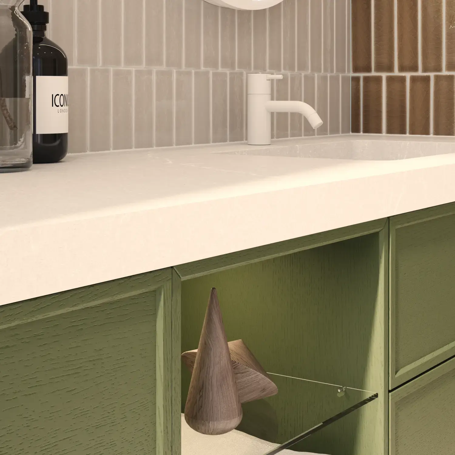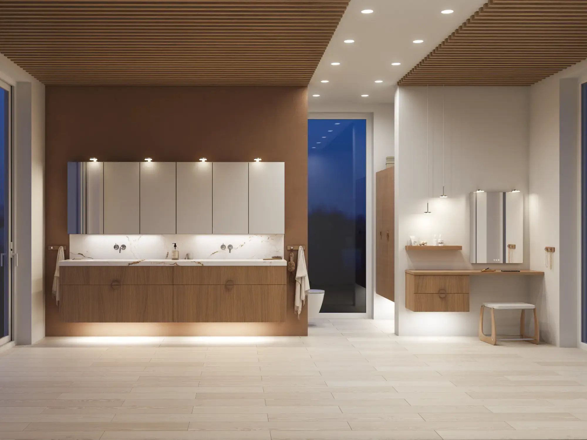 Pair it with the Linear lamp for a striking, contemporary lighting effect and complete the look with a wooden bench that adds warmth and personality. A bathroom design that captures today’s trends, grounded in the timeless elegance of Calidris.