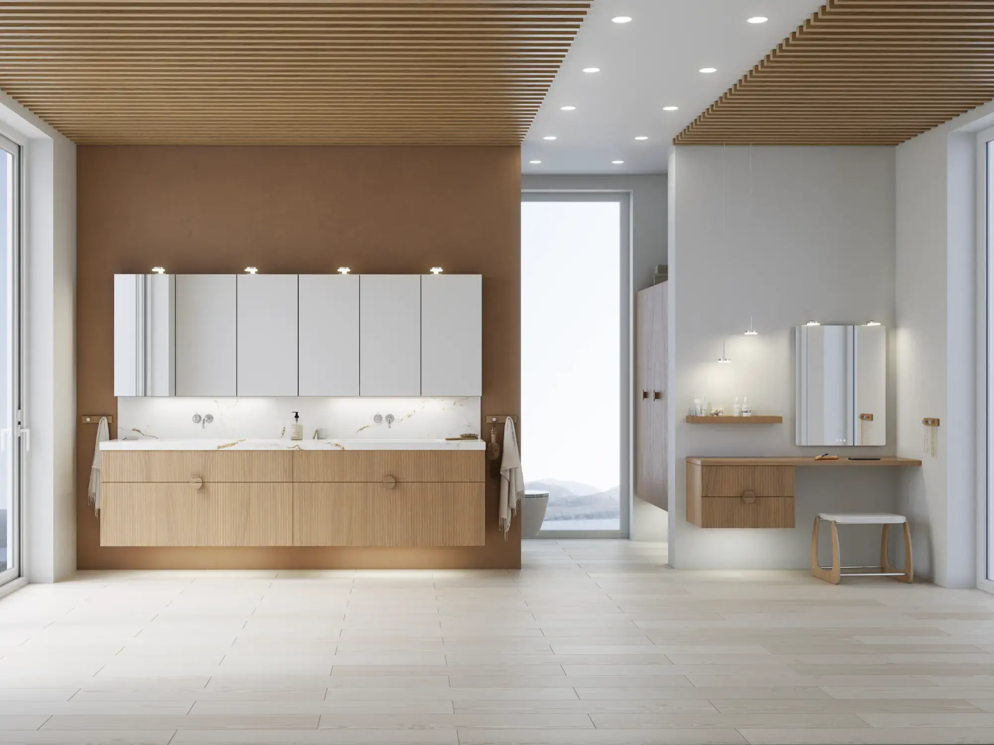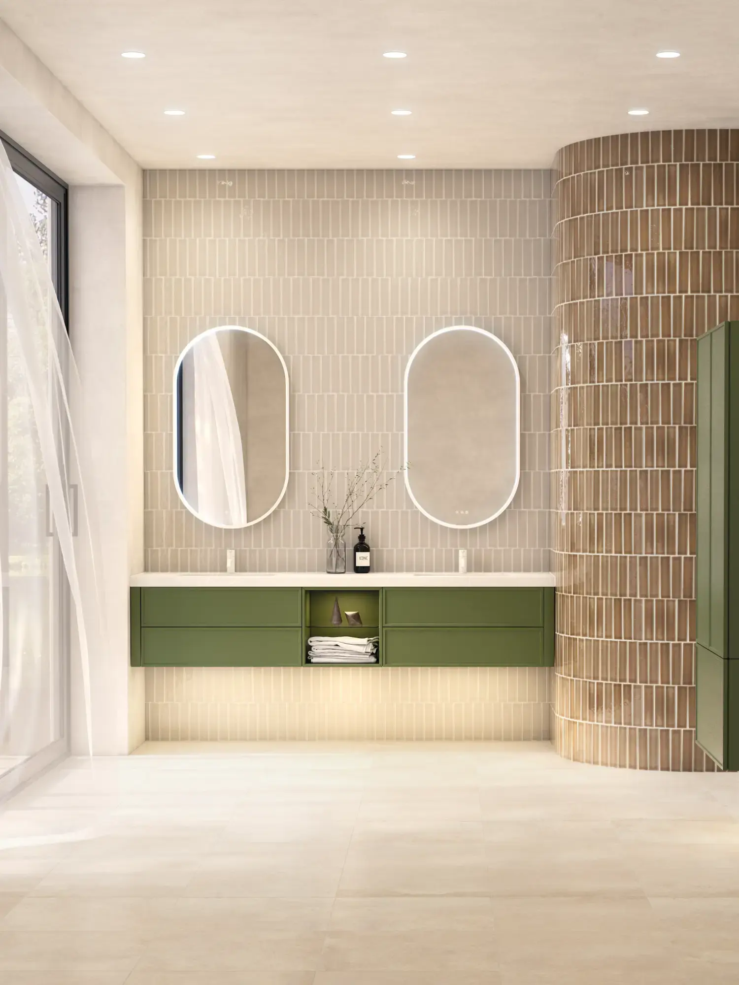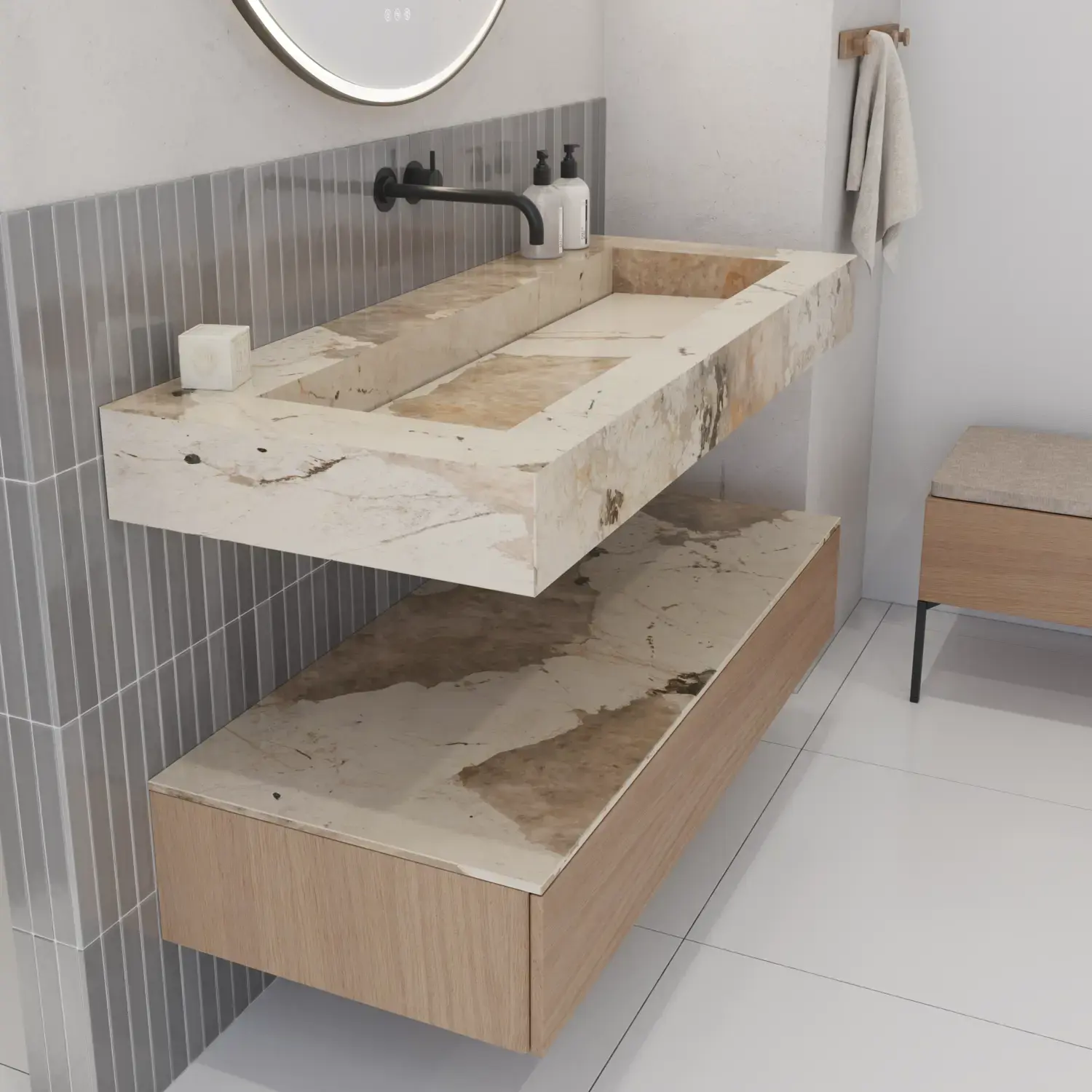 Stylish and modern bathroom inspiration with oval mirrors with light control, stone sinks, and vanity units with fine and elegant grooves in a minimalist design, the bathroom has a light and airy atmosphere with elegant lighting and refined details