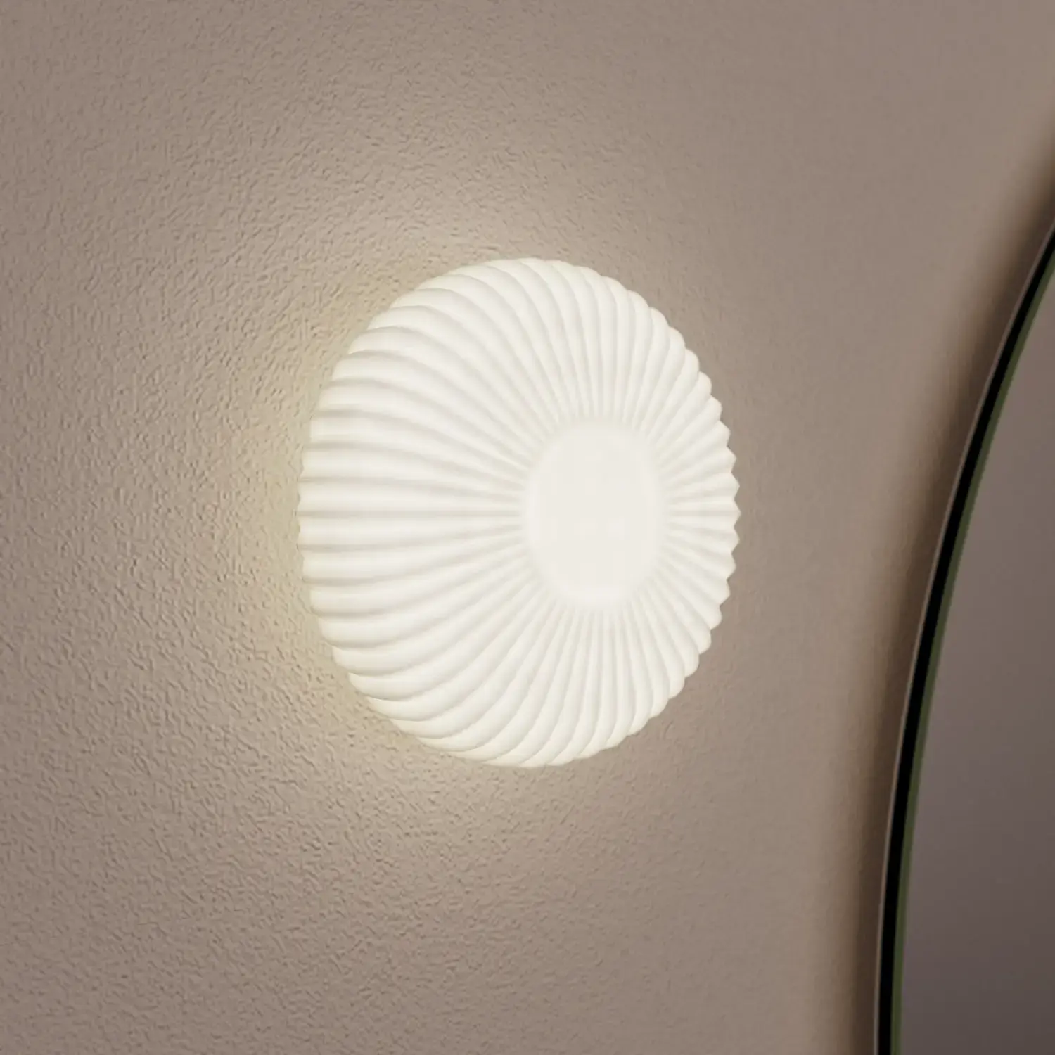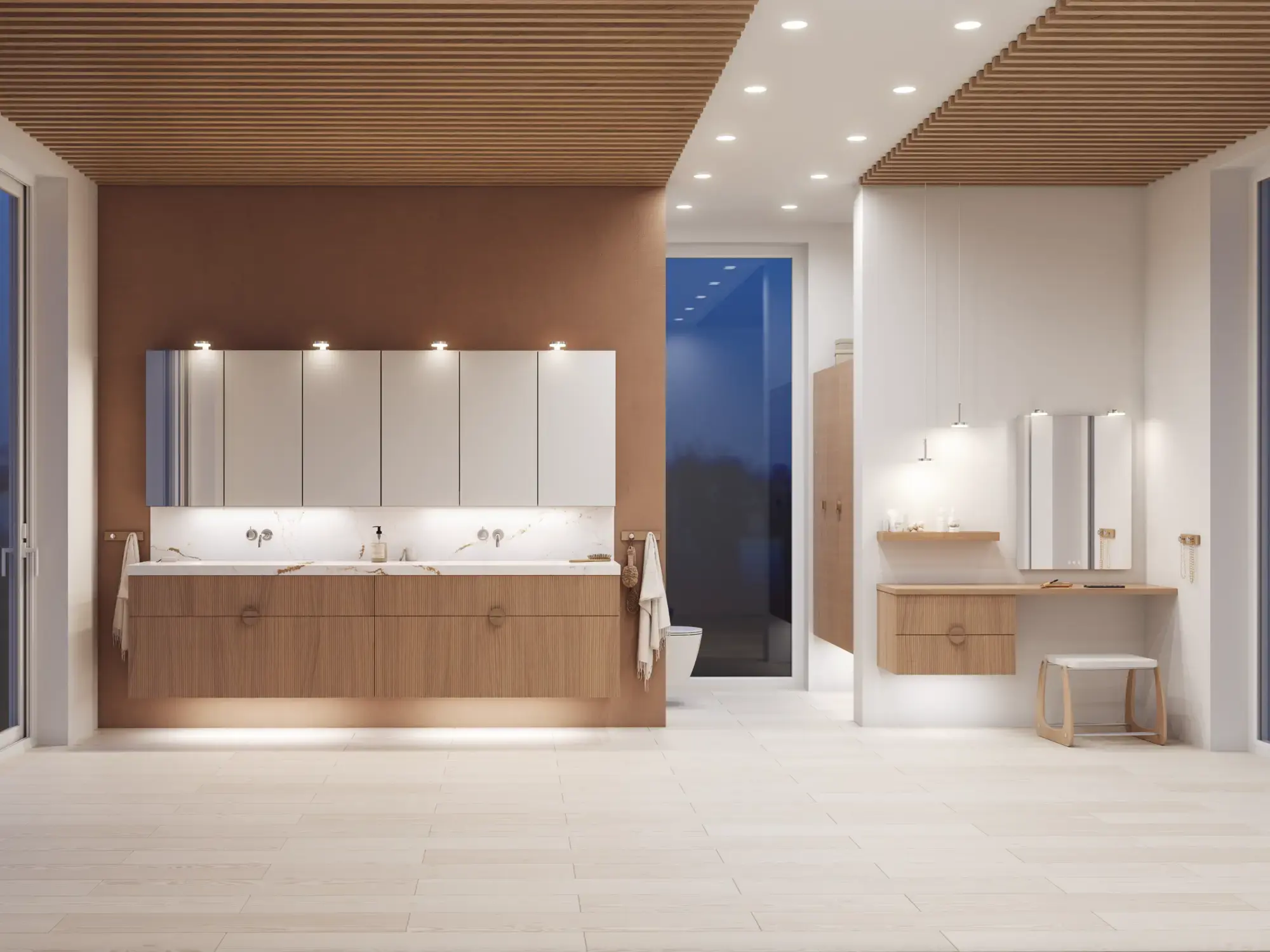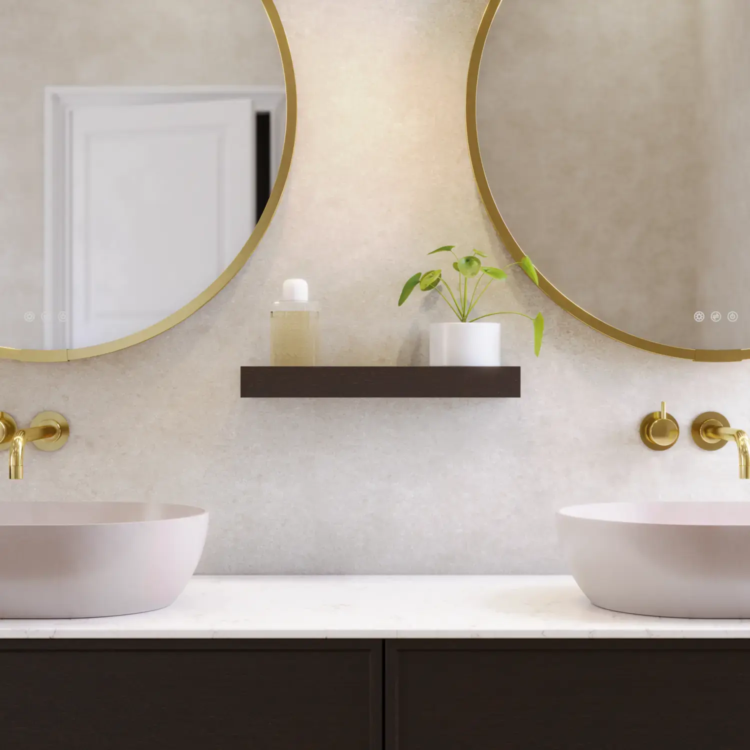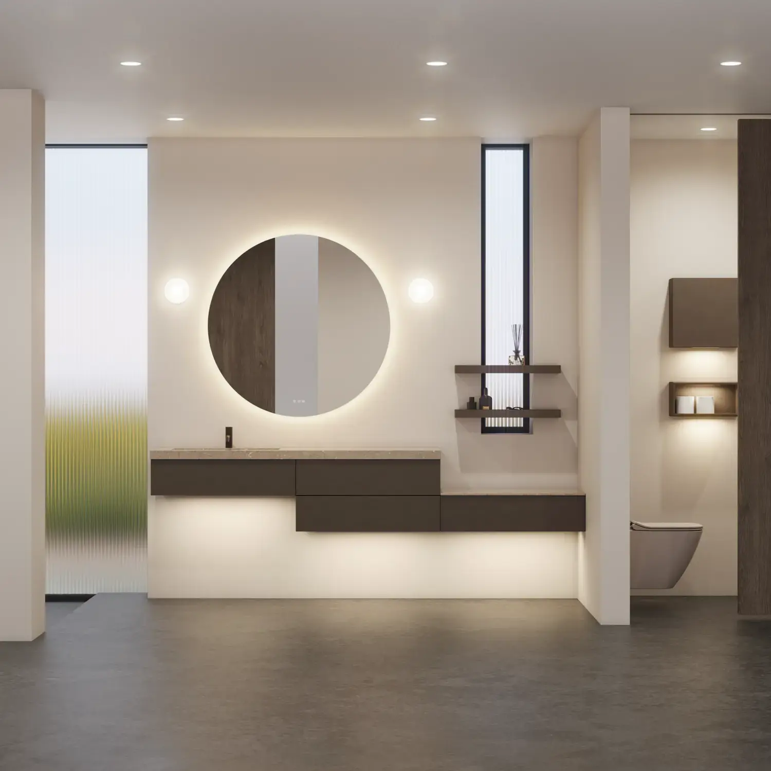 Stylish and modern bathroom inspiration with oval mirrors with light control, stone sinks, and vanity units with fine and elegant grooves in a minimalist design, the bathroom has a light and airy atmosphere with elegant lighting and refined details