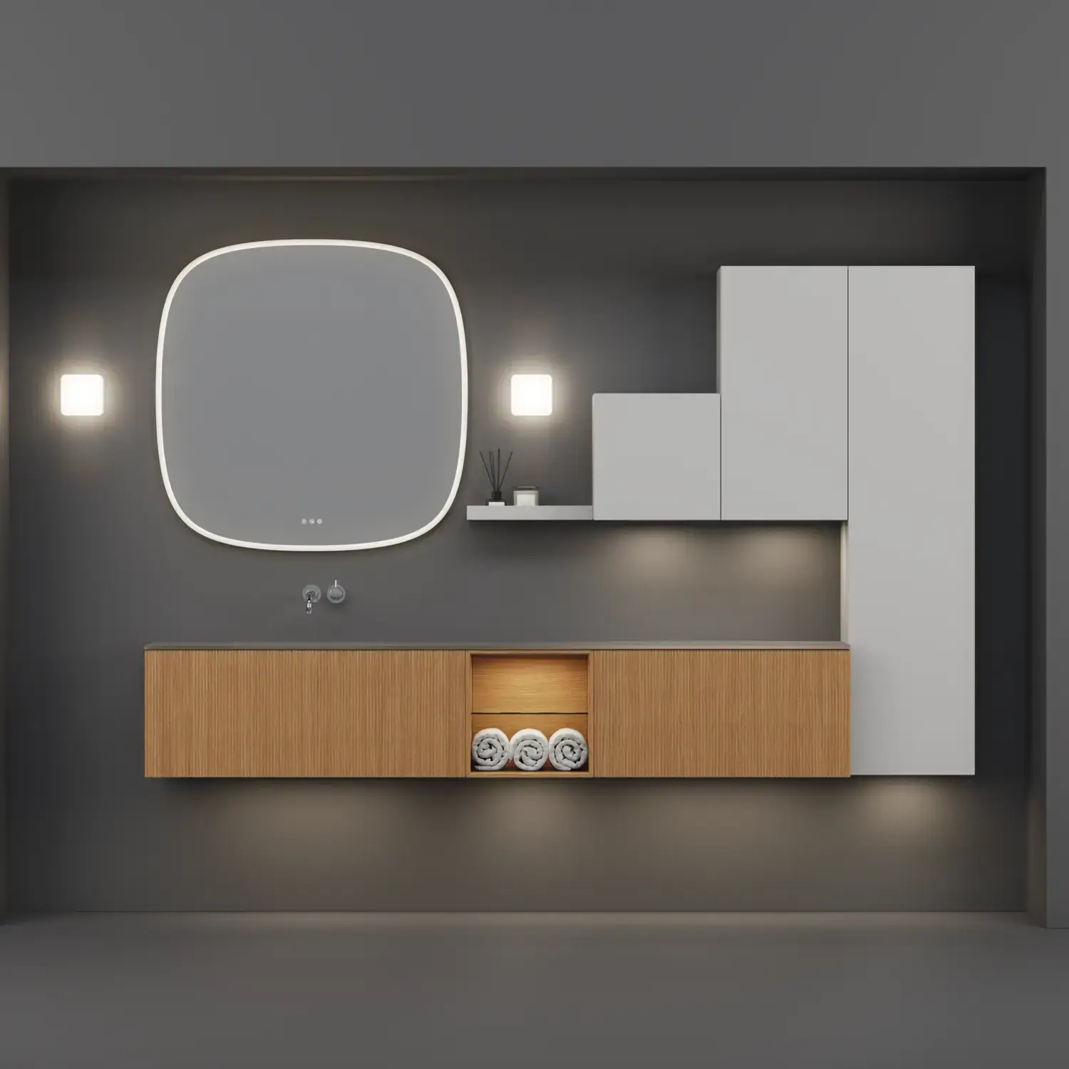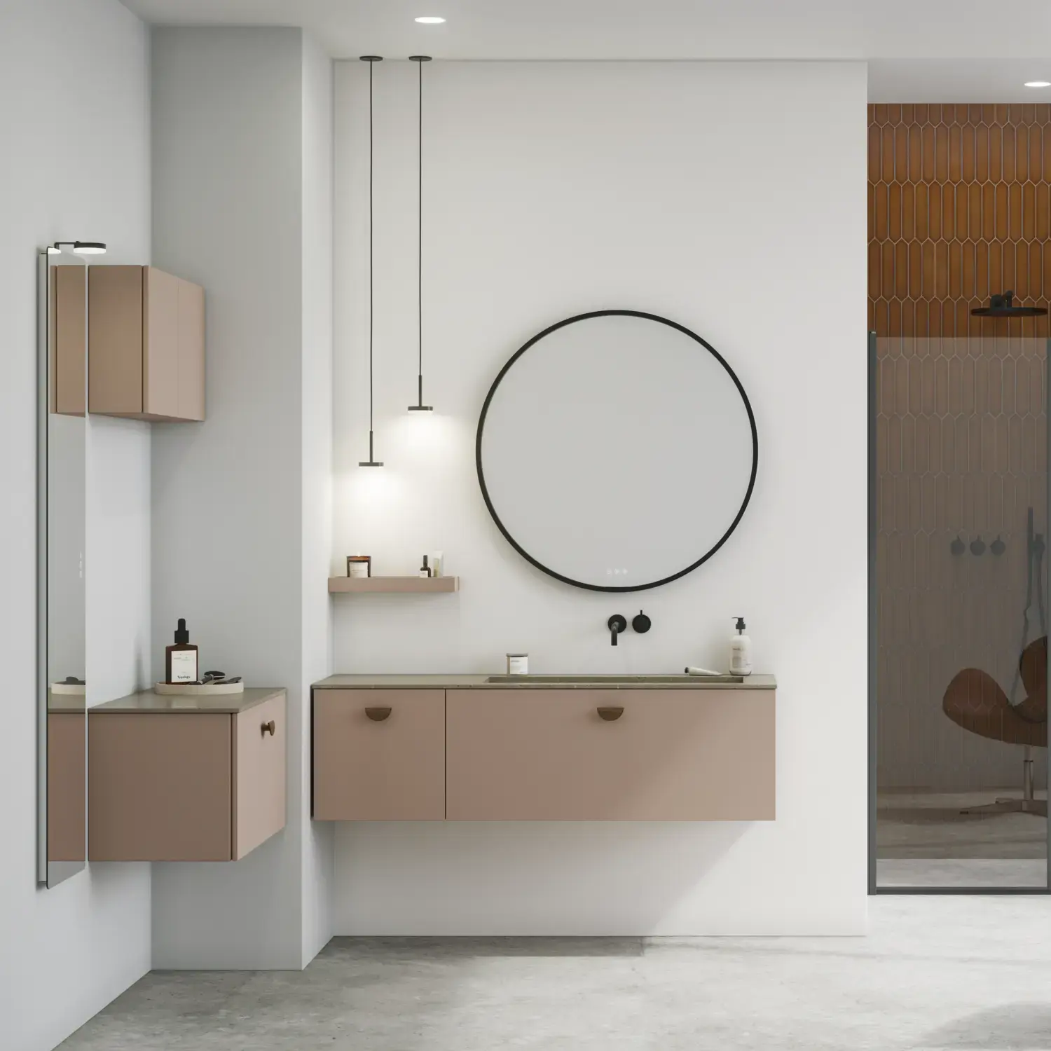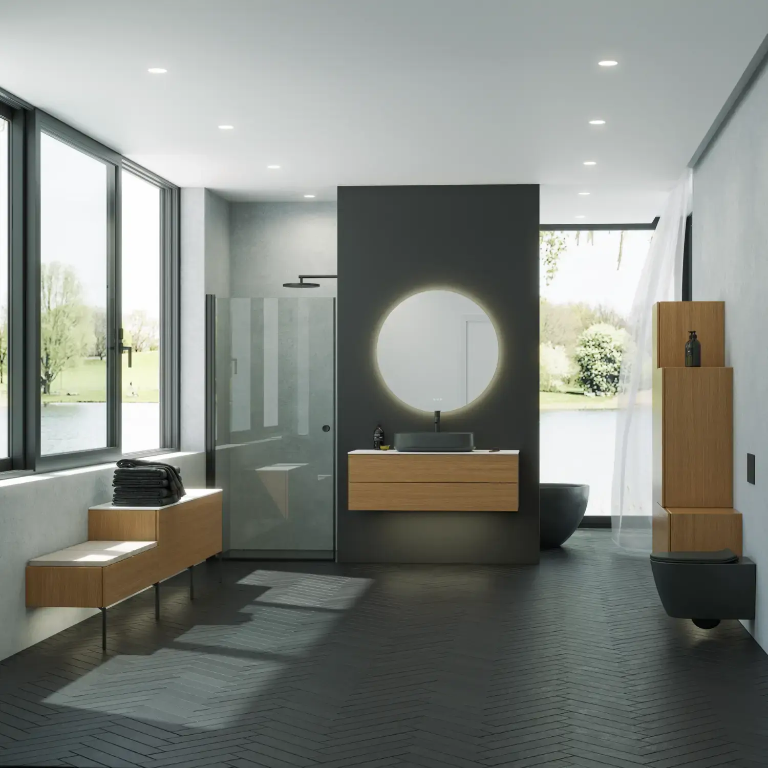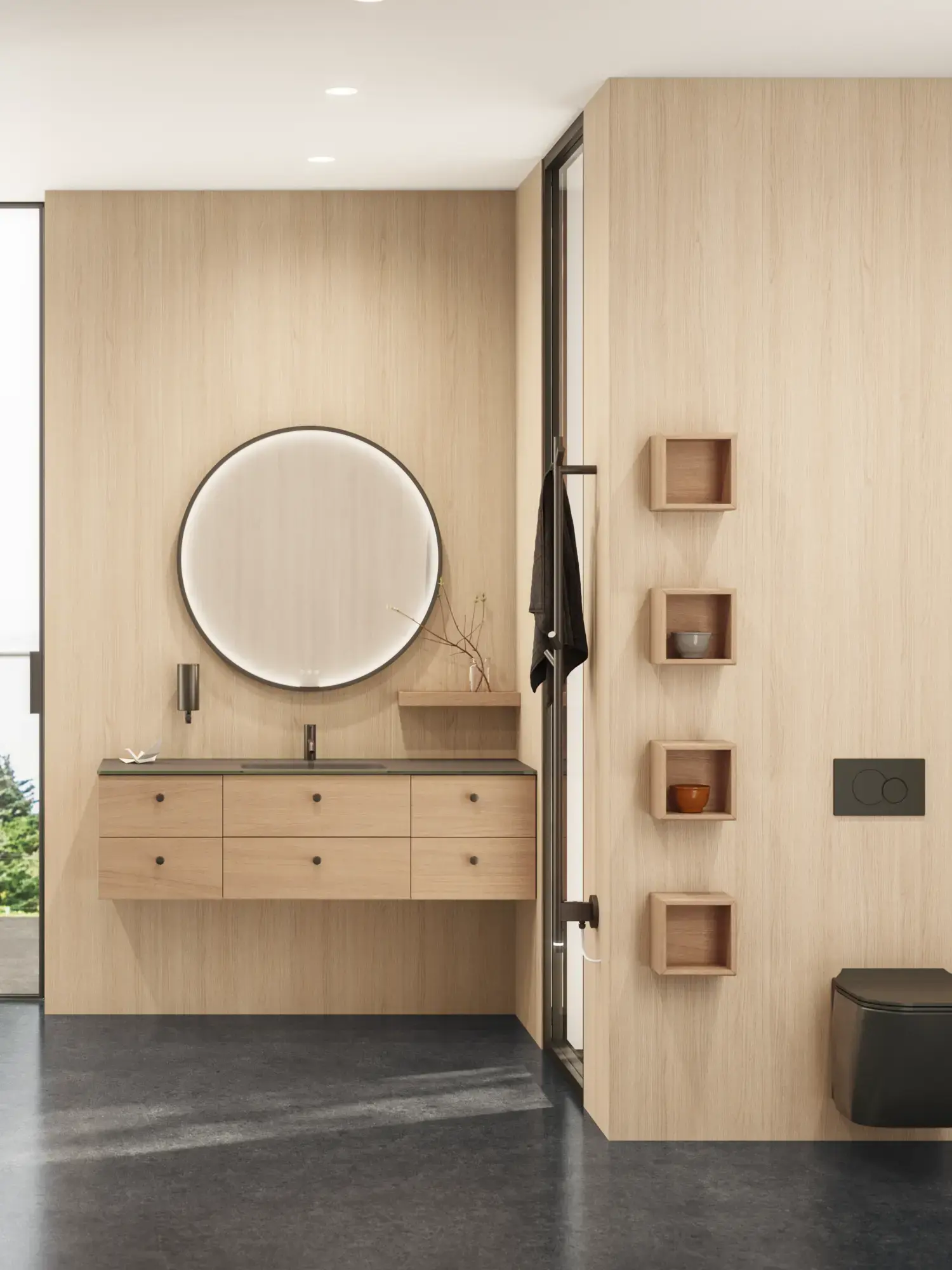 The round shapes of the Moon mirror and the new, exclusive Demi handle in wood create a sense of calm and add a touch of warmth to your bathroom.