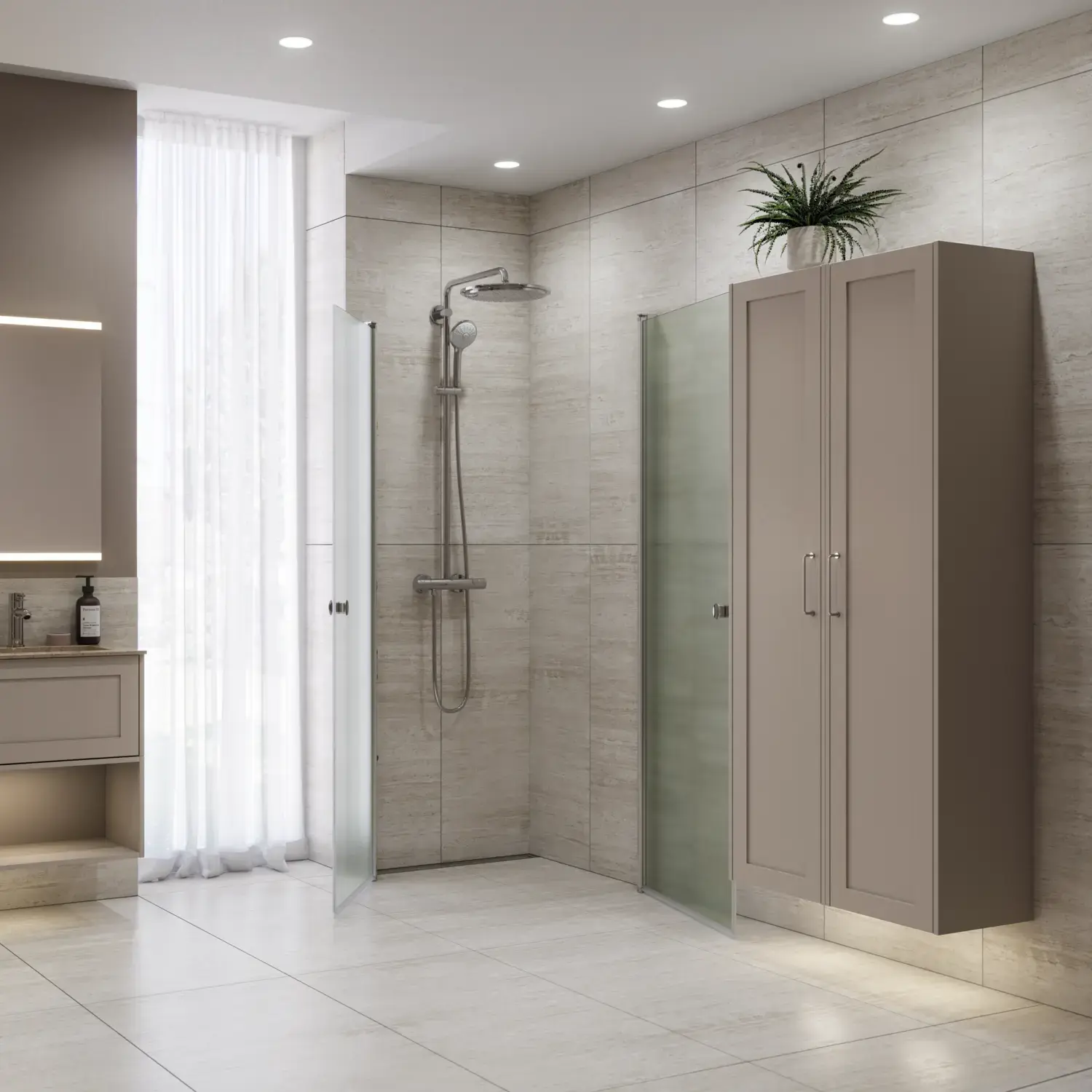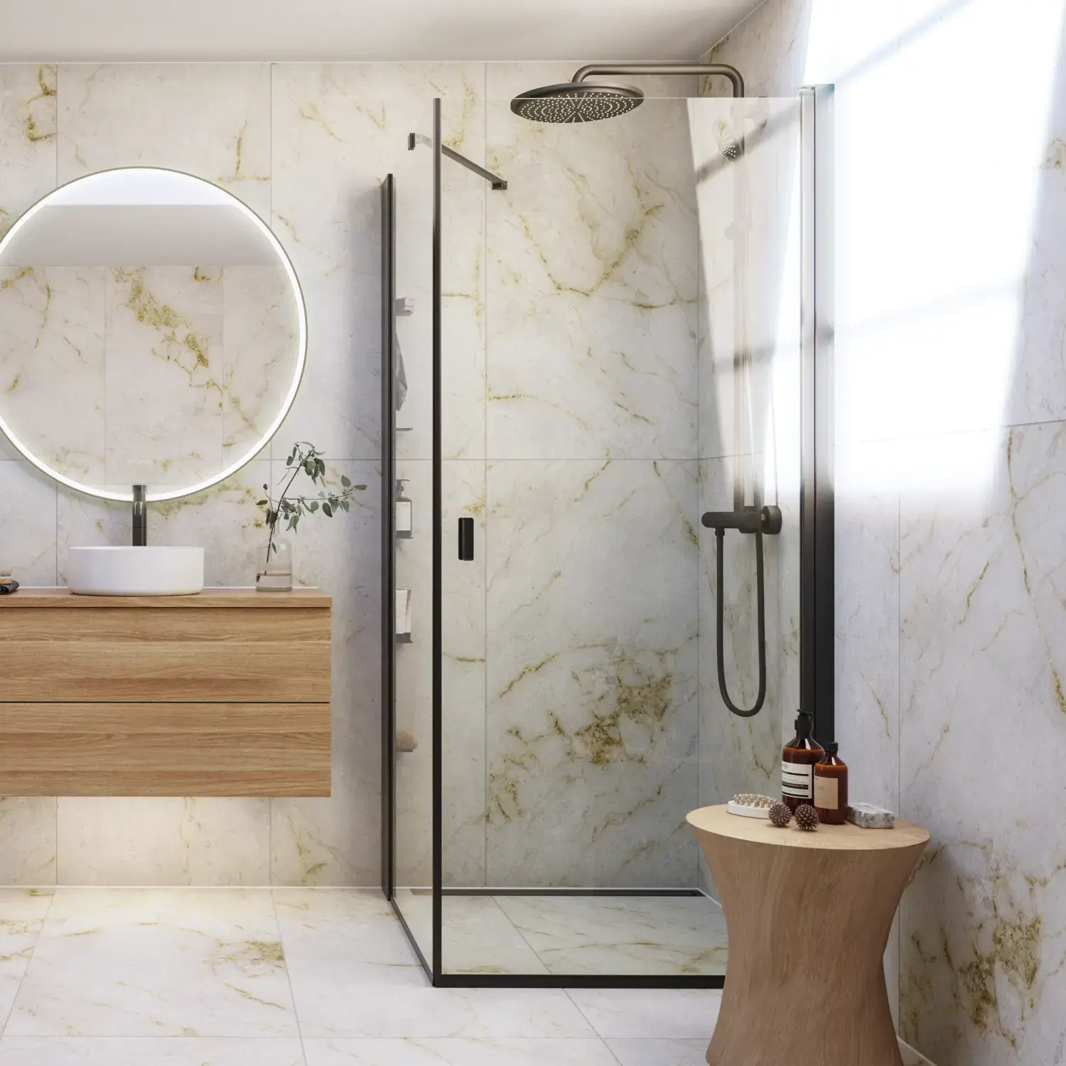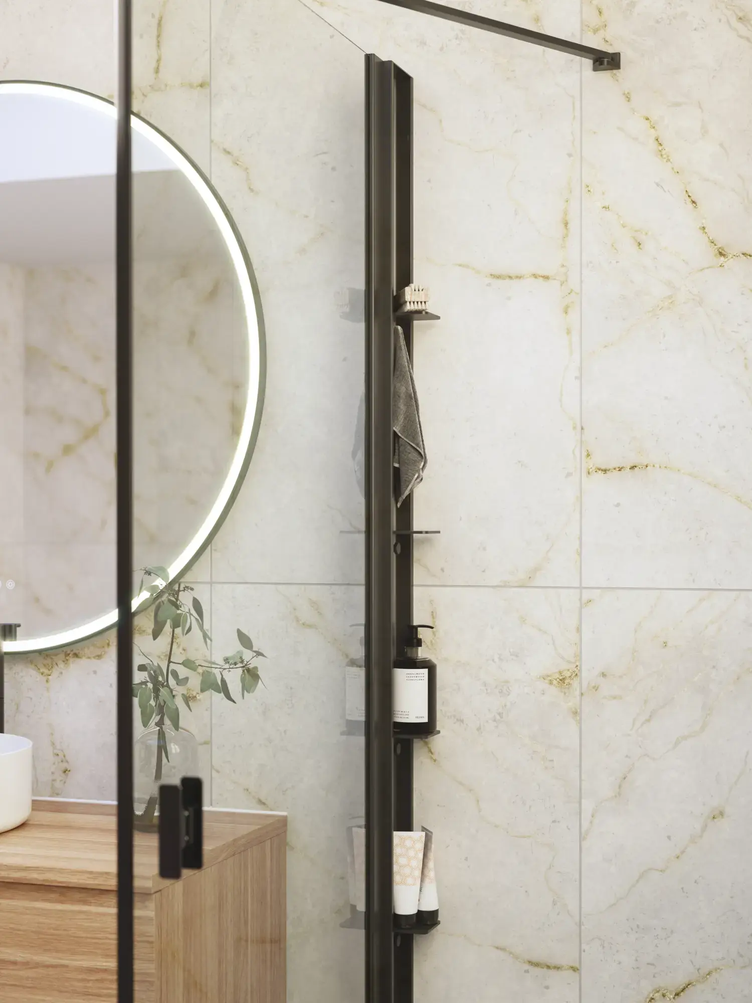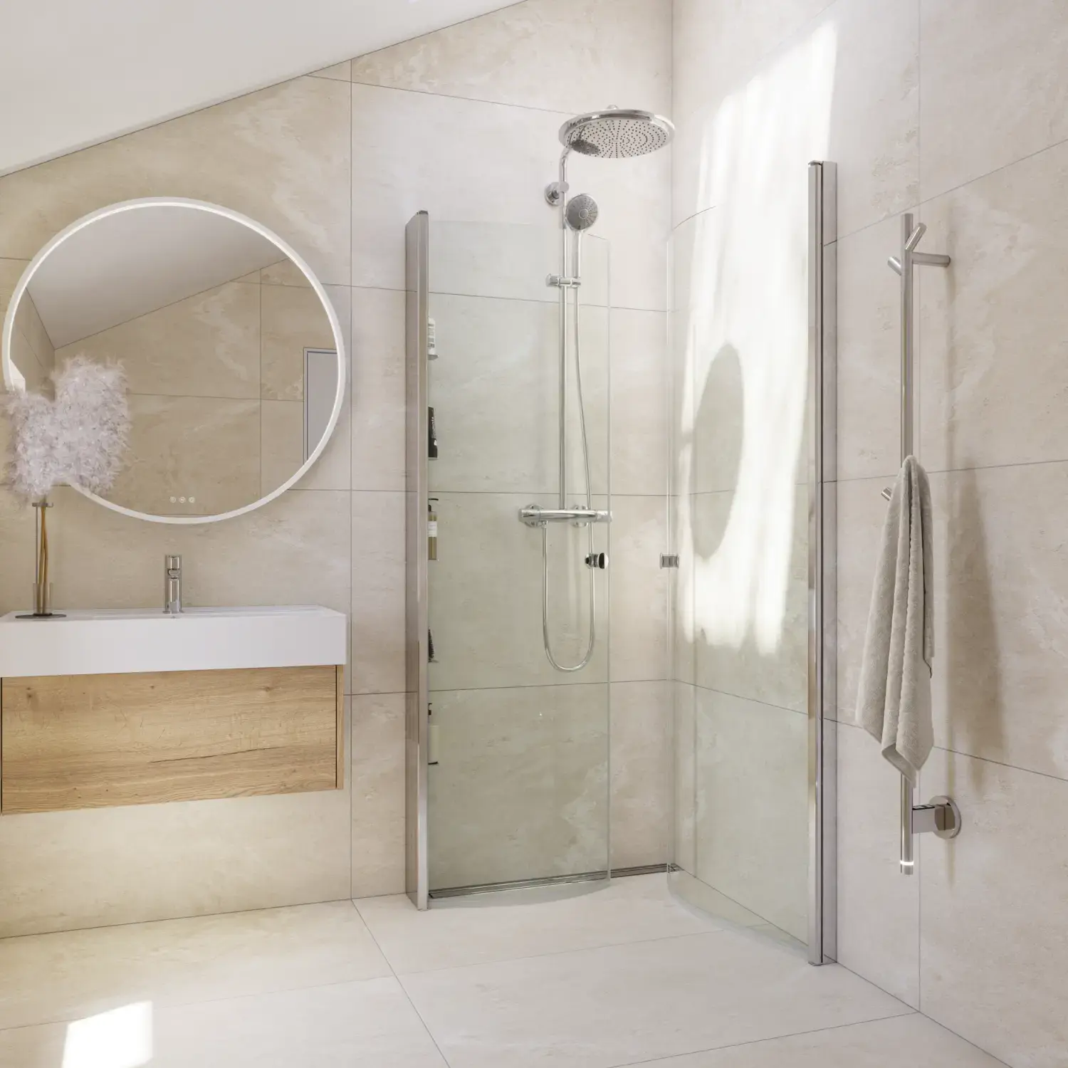 Shower panels which allow optimal use of space, as it is possible to place furniture right up the shower panel, so you have space for a wider basin or an extra cabinet.