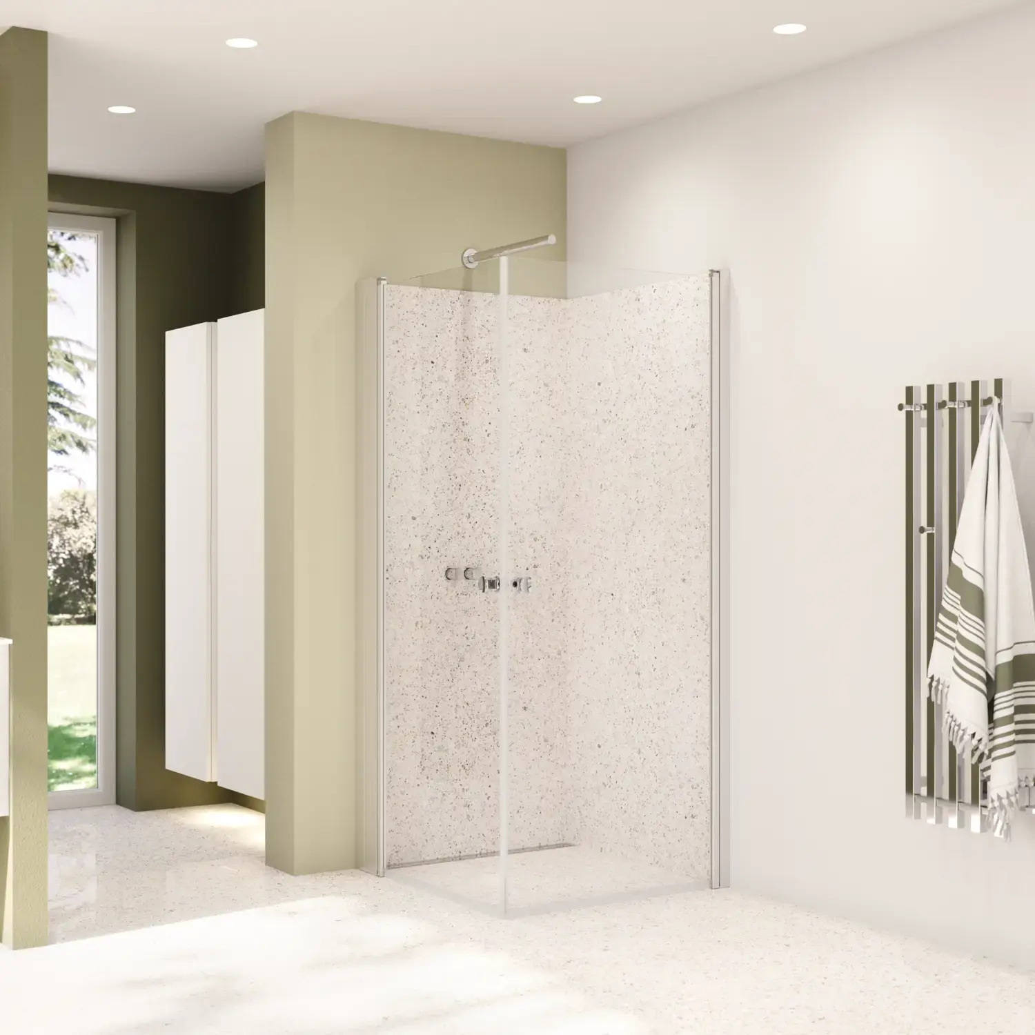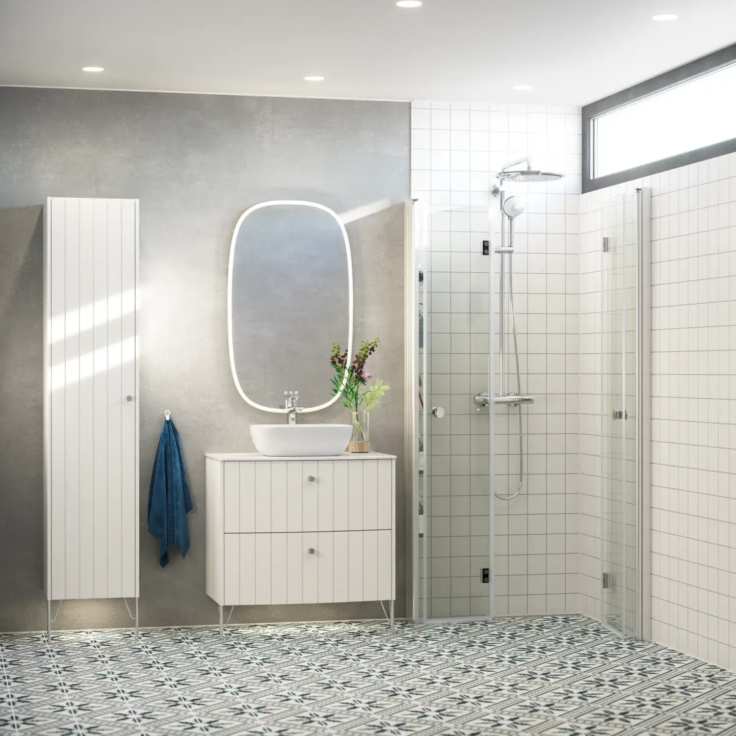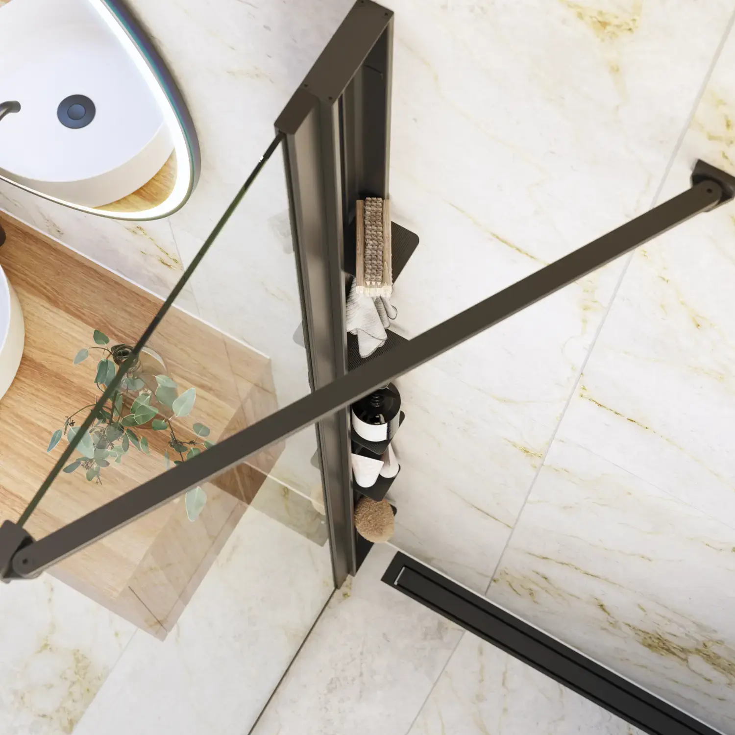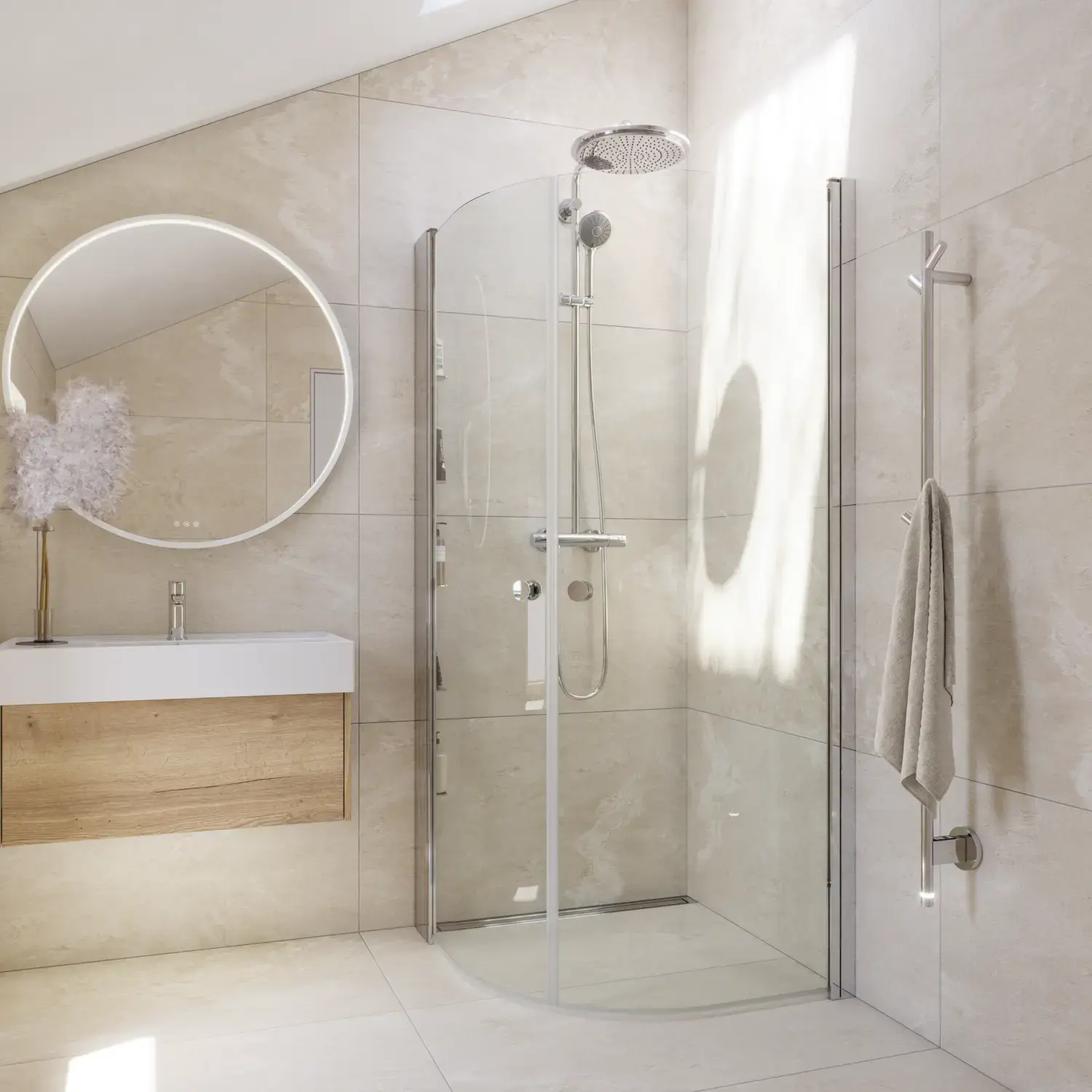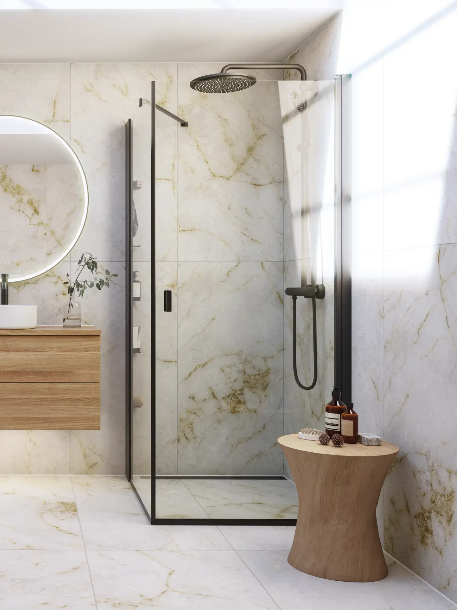 Shower panels which allow optimal use of space, as it is possible to place furniture right up the shower panel, so you have space for a wider basin or an extra cabinet.