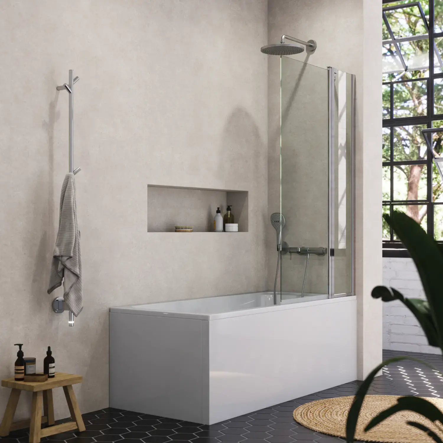 Say goodbye to shower curtains with an elegant bath screen that creates the feeling of much more space in the room. The glass screen can be pushed inwards & up against any shower fittings so that it takes up as little space as possible. The wall support is supplied as standard.