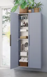 16mm plain melamine coated particle board with ABS-edging and moisture-resistant PU glue. The furniture is supplied fully assembled with brackets for installation. White vanity units with open shelf are supplied with white base and rear panels. Decor vanity units with open shelf are supplied with colour matched base and rear panels. Tall cabinets are supplied with 4 glass shelves and 1 wooden shelf. White cabinets are supplied with white top and base panels, white rear panel and fixed shelf. For decor cabinets top, base and rear panels plus fixed shelf are in alu look finish.
