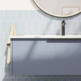 The choice here is simple and elegant with striped fronts and just one drawer in the vanity unit. The double tall cabinet gives you endless space and notice how the black handle completes the look.