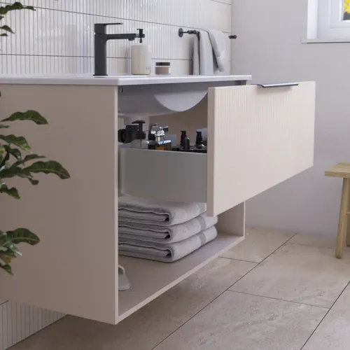 Set the mood with an open space instead of the bottom drawer. There's room for your favourite towels and a nice basket or jar to add personality.